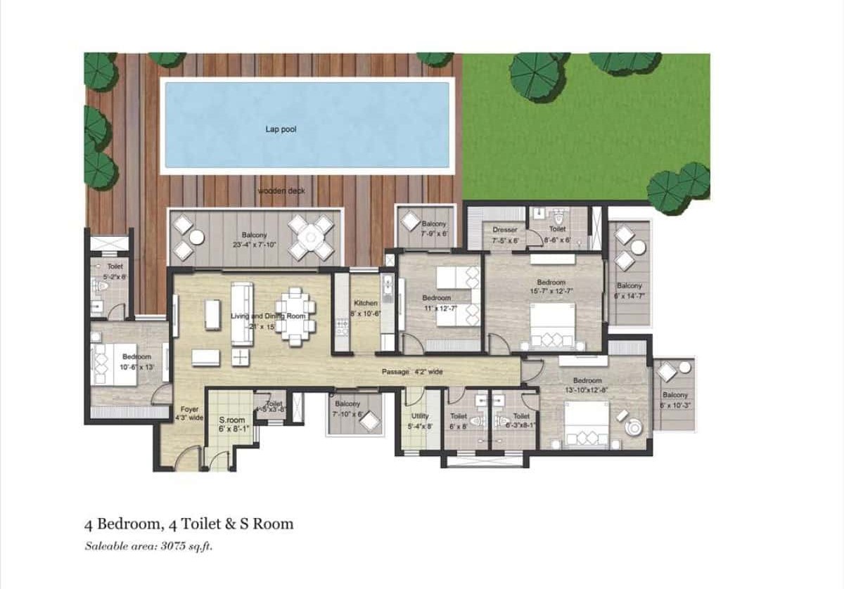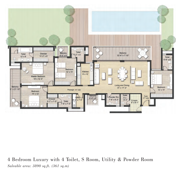 Residents enjoy automatic membership to a luxurious clubhouse with a gym, private movie theater, swimming pool, and a terrace reserved for yoga and meditation.