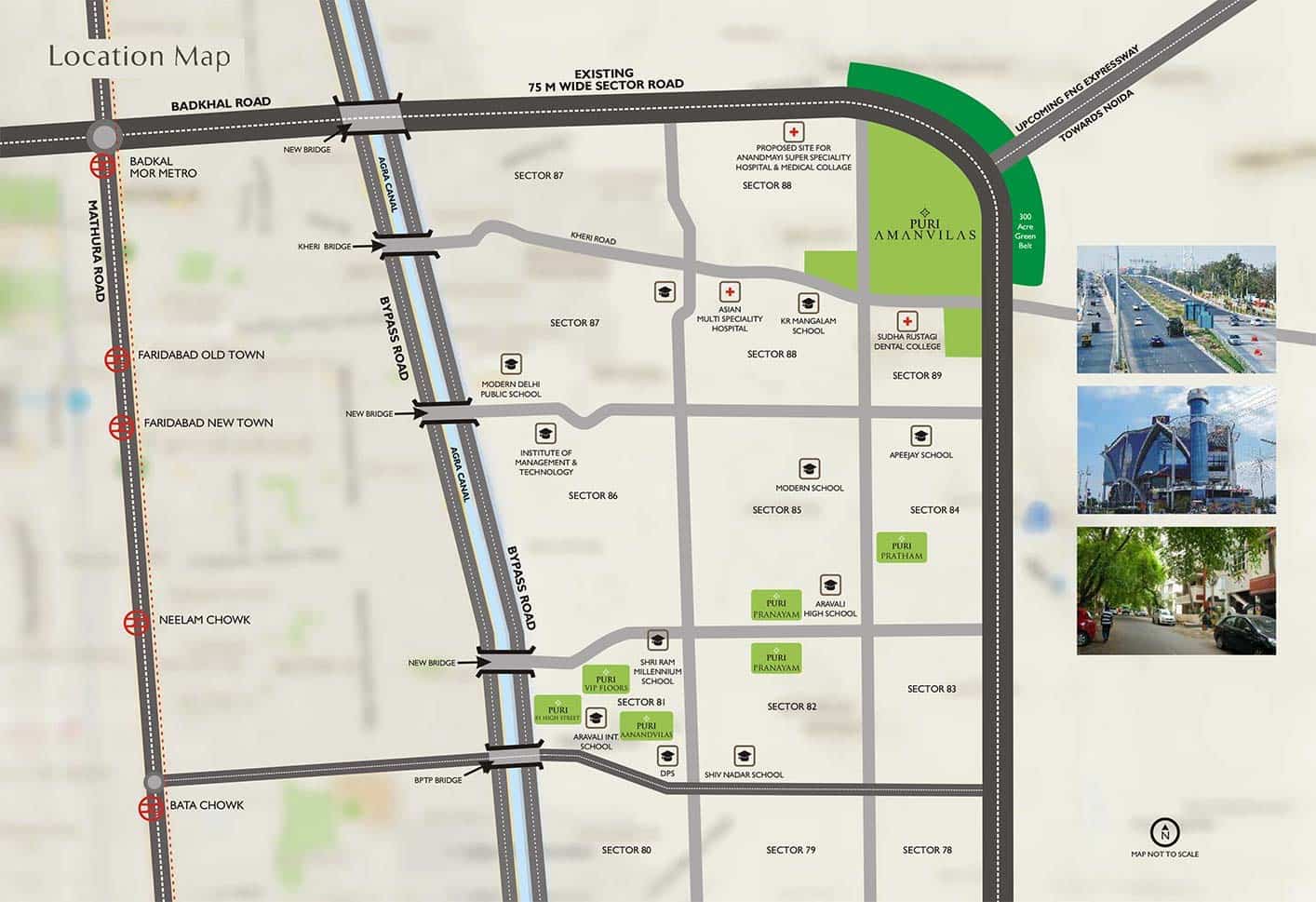 Strategically located, Puri Aanand Vilas is just 200 meters away from the BPTP Bridge and is in close proximity to the upscale Sector-14 of Faridabad. The project’s location is highly valued due to its easy access to various essential and recreational facilities. It is situated 2.5 km from the nearest metro station and is connected via a direct 6-lane express road from the Badarpur border.