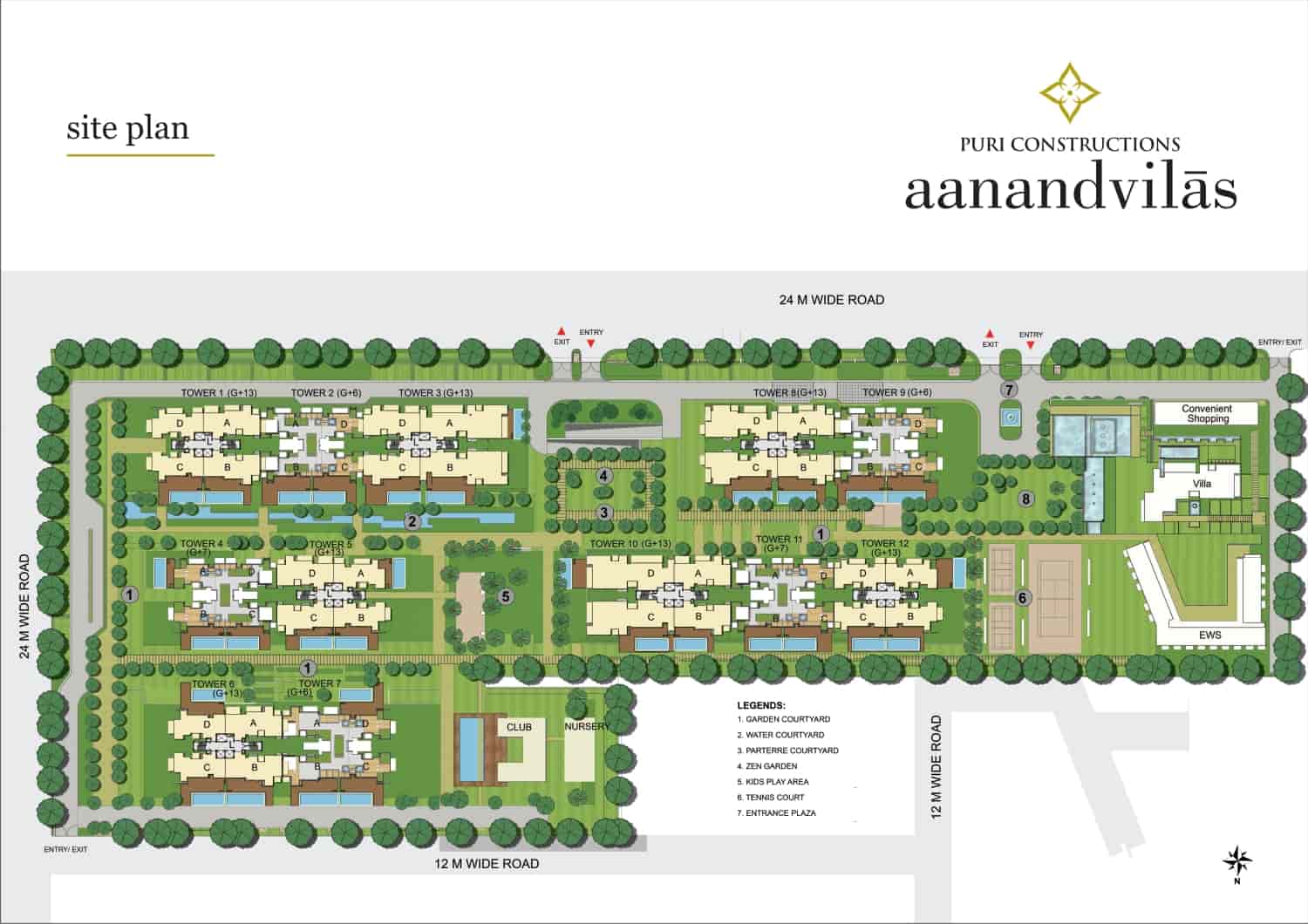 The site plan of Puri Aanand Vilas offers a detailed look at the project’s layout, covering 12 acres of prime land. It features 12 towers with G+6 and G+13 floors, designed to house luxurious 3BHK and 4BHK apartments, including options with servant rooms. The plan emphasizes extensive green spaces, water features, and a central clubhouse with premium amenities. Additional highlights include dedicated areas for sports, recreation, and seamless connectivity to major roads, ensuring a comprehensive and luxurious living experience.